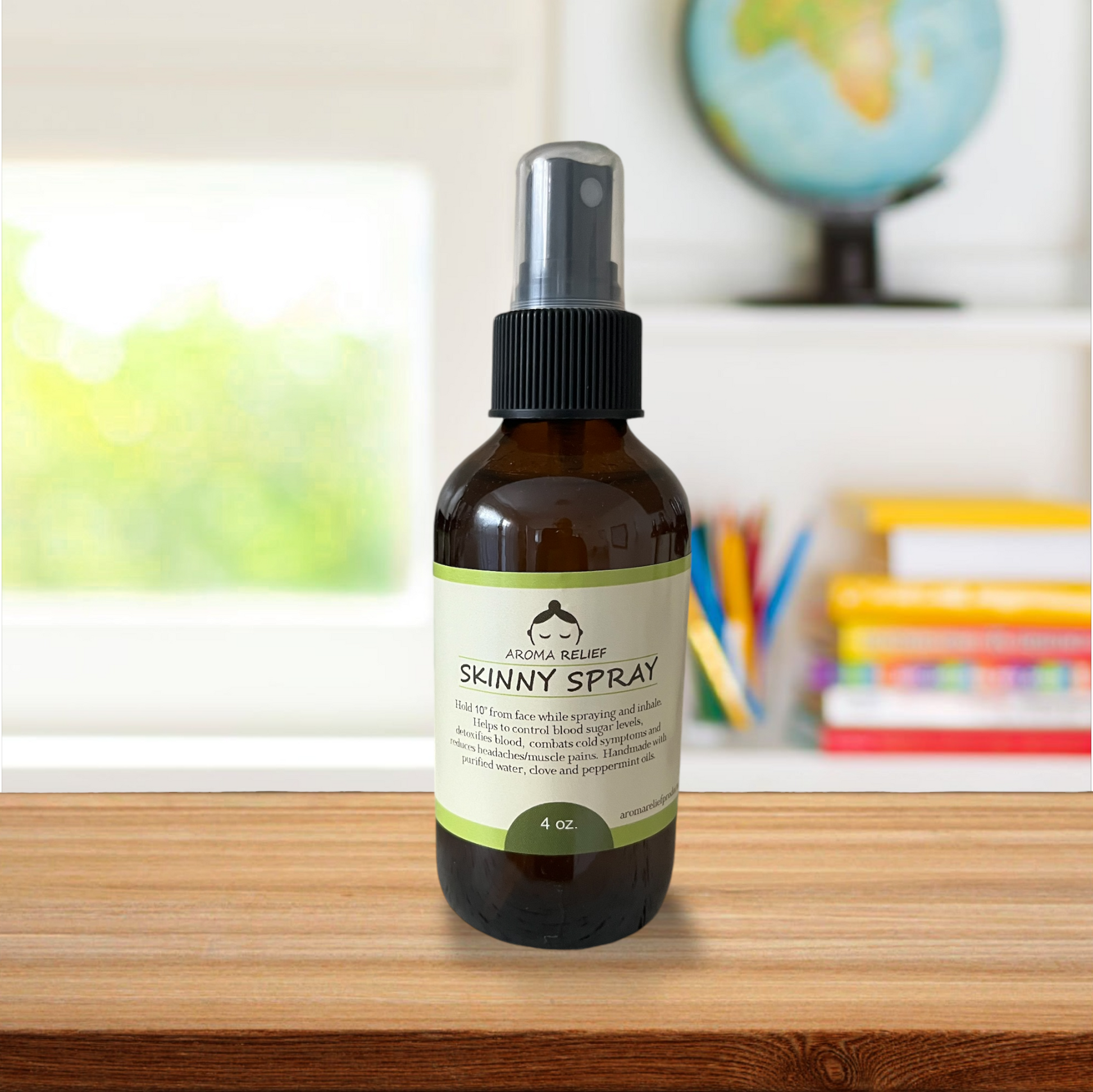 Helps to control blood sugar levels, detoxifies blood, combats cold symptoms and reduces headaches/muscle pains. Keep by your desk at work to increase concentration. Handmade with purified water, clove and peppermint oils.